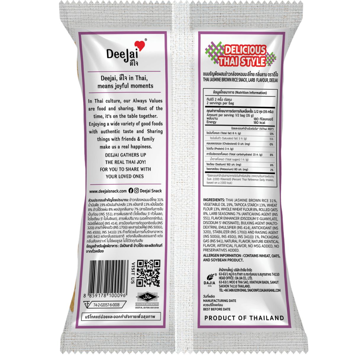 | ส่วนประกอบสำคัญโดยประมาณ: ข้าวกล้องหอมมะลิไทย 31% น้ำมันพืช 19% แป้งมันสำปะหลัง 13% แป้งสาลี 13% แป้งโฮลวีต 8% ข้าวโอ๊ตแผ่น 8% ผงปรุงกลิ่นลาบ 7% (สารป้องกันการจับเป็นก้อน (INS 551), สารเพิ่มรสชาติ (ไดโซเดียม 5′- กัวไนเลต, ไดโซเดียม 5′-ไอโนซิเนต), สารเพิ่มปริมาณ (มอลโทเดกซ์ ทริน), สารป้องกันการเกิดออกซิเดชั่น (INS 320)) สารทำให้คงตัว (INS 170(i)) และสารช่วยให้ฟู (INS 500(ii), INS 450(i), INS 341(i)) 1% ก๊าซที่ช่วยในการเก็บรักษาอาหาร (INS 941) แต่งกลิ่นธรรมชาติ แต่ง กลิ่นเลียนธรรมชาติ แต่งกลิ่นสังเคราะห์ ไม่ใส่ผงชูรส ไม่ใช้วัตถุกันเสีย ข้อมูลสำหรับผู้แพ้อาหาร : มีแป้งสาลี ข้าวโอ๊ต และ ผลิตภัณฑ์จากถั่วเหลือง |