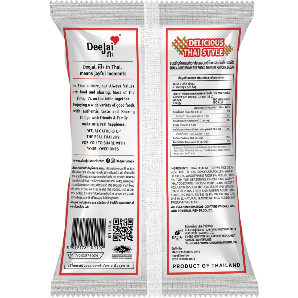 | INGREDIENTS: THAI JASMINE BROWN RICE 31%, VEGETABLE OIL 19%, TAPIOCA STARCH 13%, WHEAT FLOUR 13%, WHOLE WHEAT FLOUR 8%, ROLLED OATS 8%, TOM YUM SEASONING 7% (BULKING AGENT(MALTODEXTRIN), THICKENER(INS 1440), ACIDITY REGULATOR(INS 330), NATURAL COLOR(INS 160C(i))), STABILIZER(INS 170(i)) AND RAISING AGENT (INS500(ii), INS 450(i), INS 341(i)) 1%, PACKAGING GAS(INS 941), NATURAL FLAVOR, NO MSG ADDED, NO PRESERVATIVES ADDED. ALLERGEN INFORMATION : CONTAINS WHEAT, OATS, AND SOYBEAN, FISH PRODUCT. |